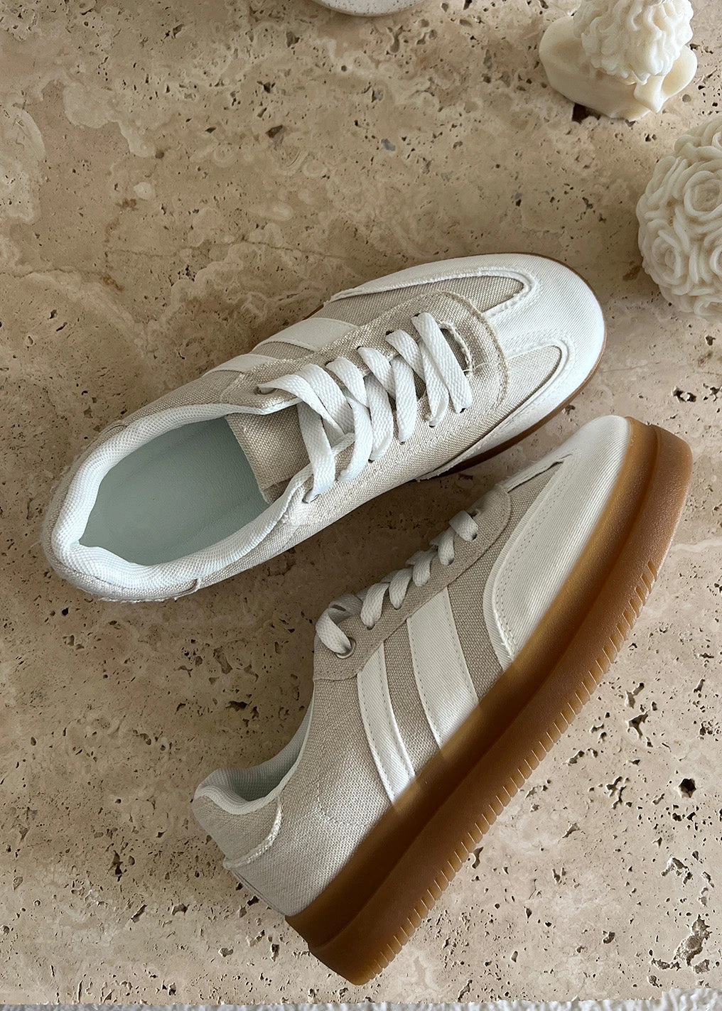 Schlicht, modern und vielseitig – dieser Sneaker passt einfach zu allem. Das Obermaterial in Beige kombiniert Textil- und Glattleder-Optik für einen cleanen Look. Die weiße Schnürung und die klassischen Streifen sorgen für sportliche Akzente. Die robuste Gummisohle in Karamellbraun bietet festen Halt und einen angenehmen Laufkomfort. Ideal für den Alltag – ob zur Jeans, Shorts oder zum Kleid.