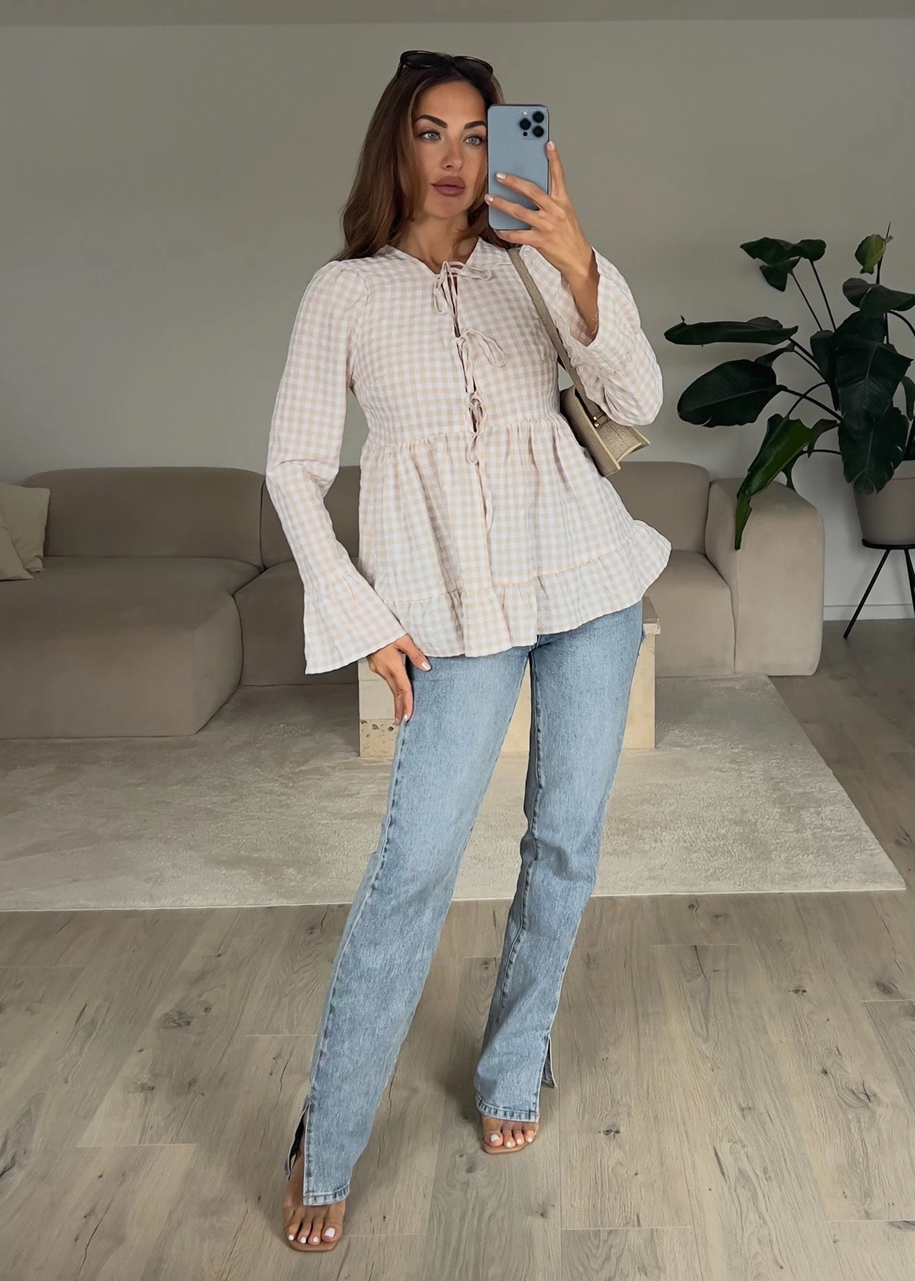Langärmlige Bluse mit Karomuster, Bindebändern vorn und ausgestelltem Schnitt mit Rüschen
