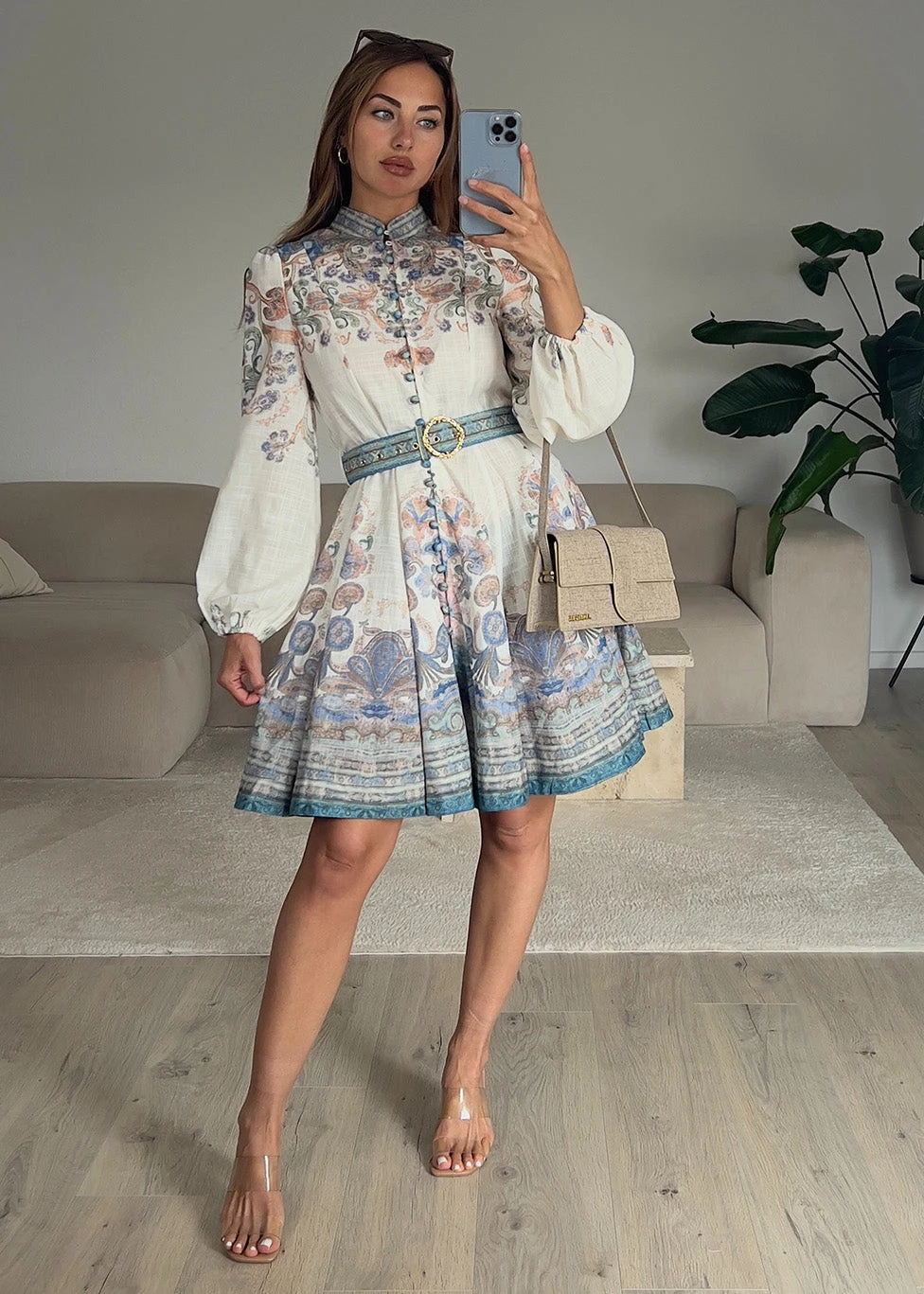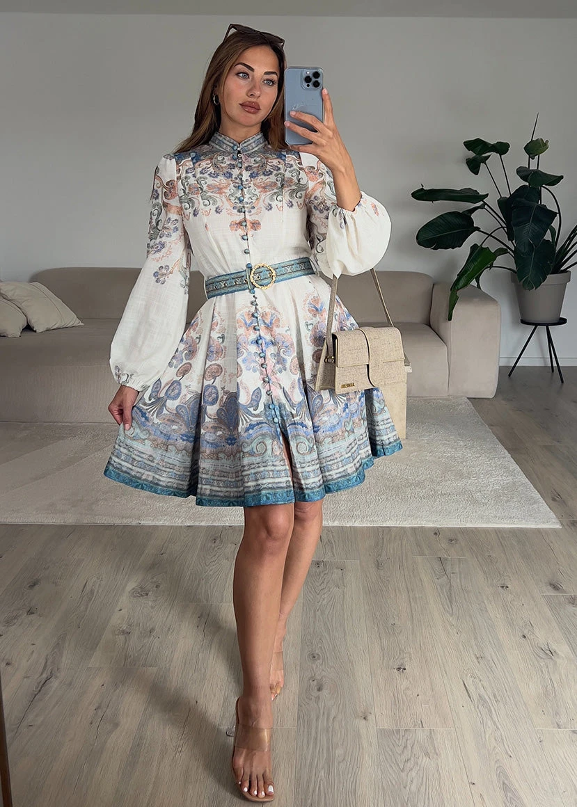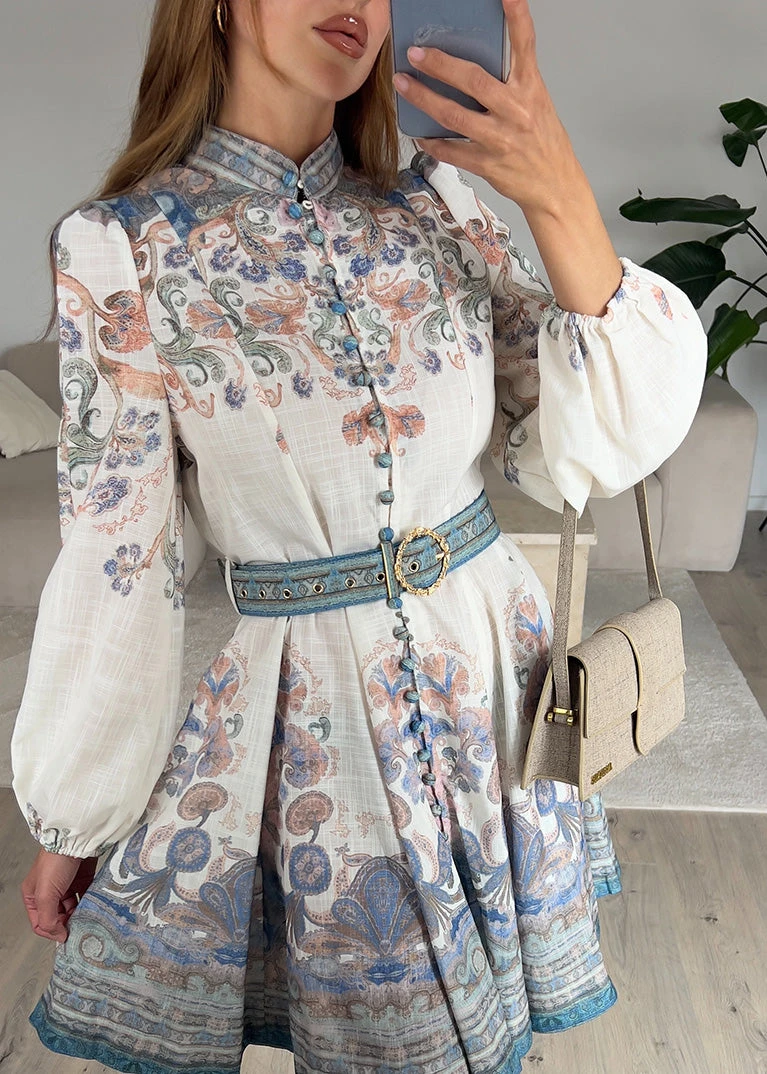 Dieses Minikleid ist ein echtes Statement-Piece: Der kunstvolle Allover-Print und die aufwendigen Details wie die durchgehende Knopfleiste, die langen Ballonärmel und der abnehmbare Taillengürtel mit dekorativer Schnalle verleihen dem Kleid einen edlen, fast königlichen Boho-Charme.