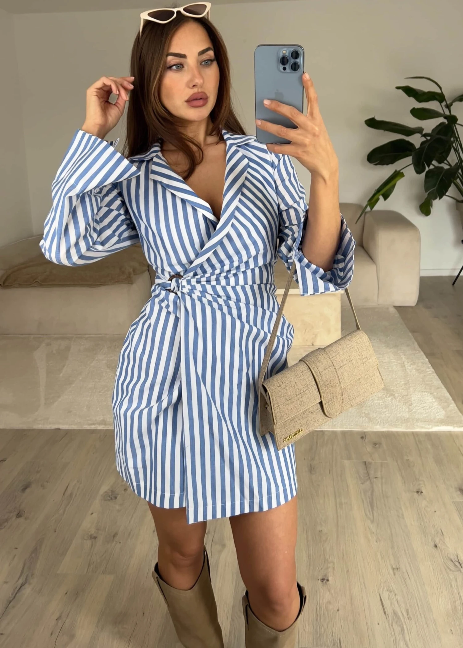 Dieses stilvolle Wickelkleid mit blau-weißen Streifen ist die perfekte Kombination aus Eleganz und Lässigkeit. Die taillierte Passform mit seitlichem Gürtel betont die Figur und sorgt für eine schmeichelhafte Silhouette. Der tiefe V-Ausschnitt und die leicht ausgestellten Ärmel verleihen dem Look eine feminine Note. Kombiniere es mit Stiefeln oder Sandalen für den perfekten Look.