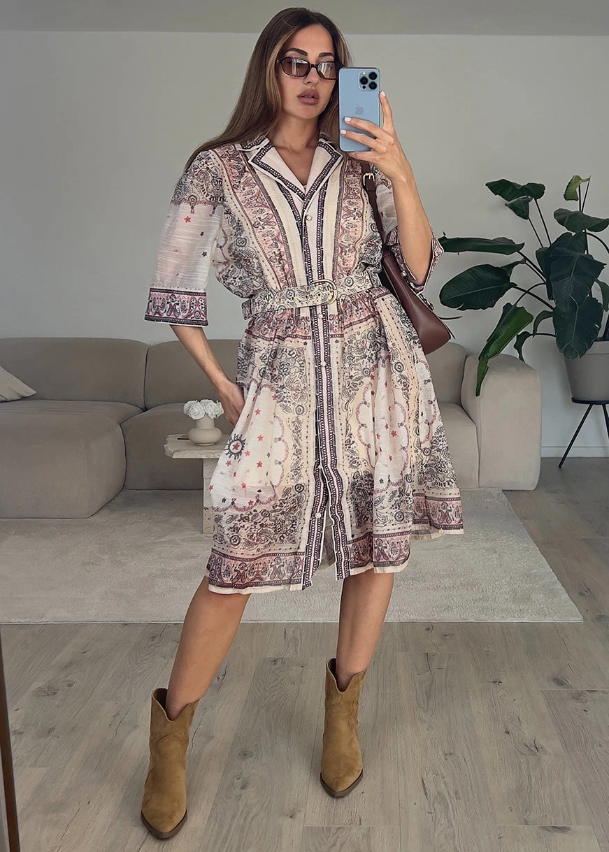 Hemdblusenkleid mit Paisley-Muster, Taillengürtel, Knopfleiste und halblangen Ärmeln aus leichtem Stoff.
