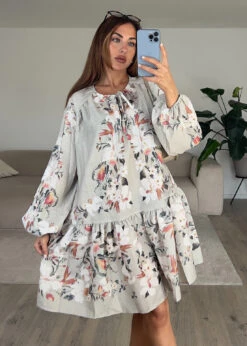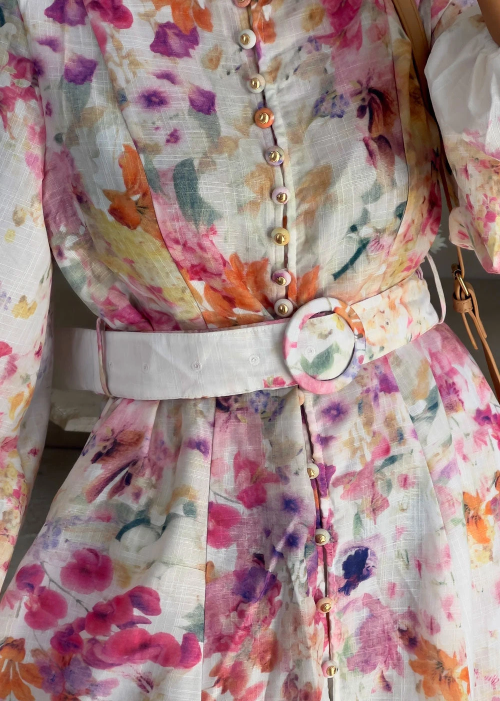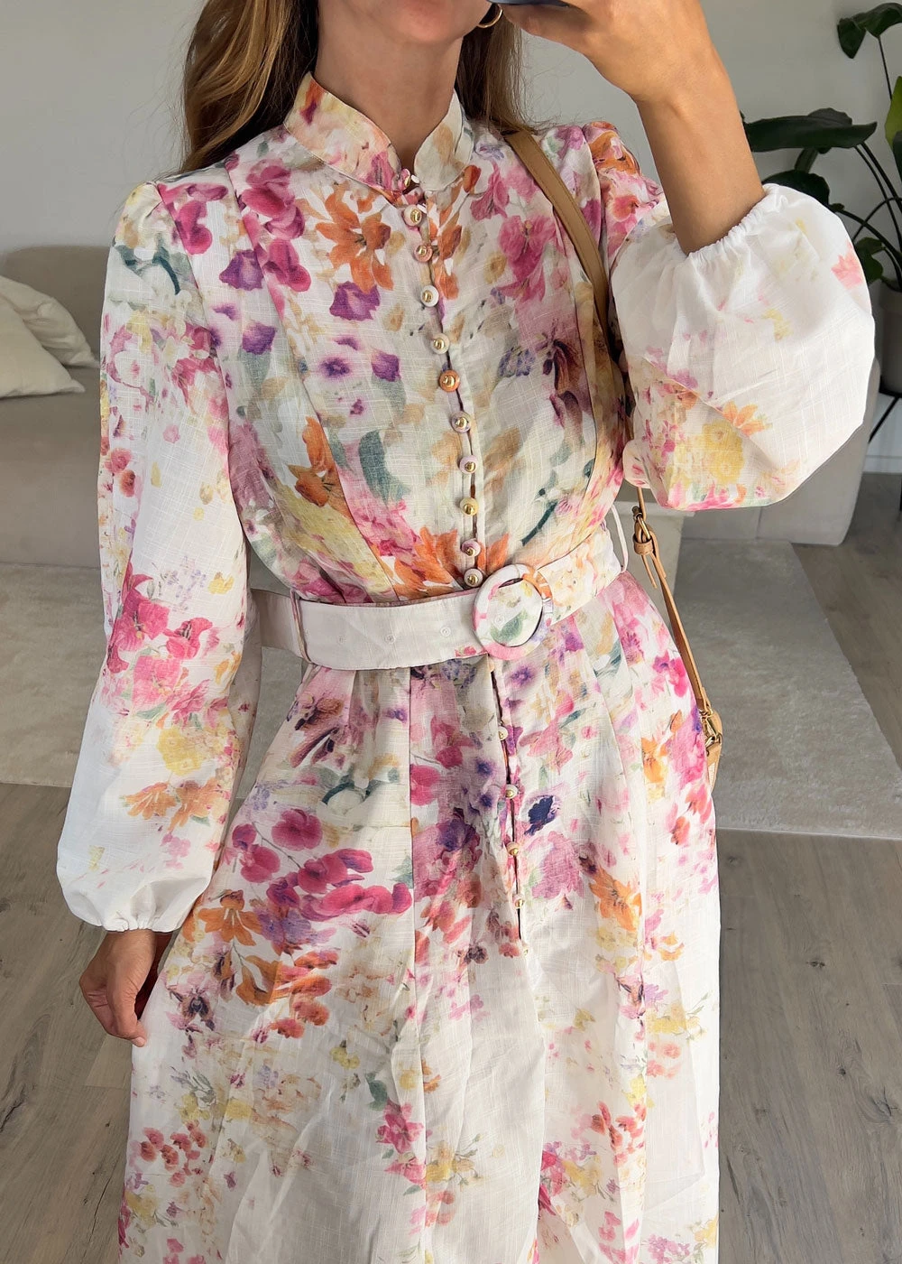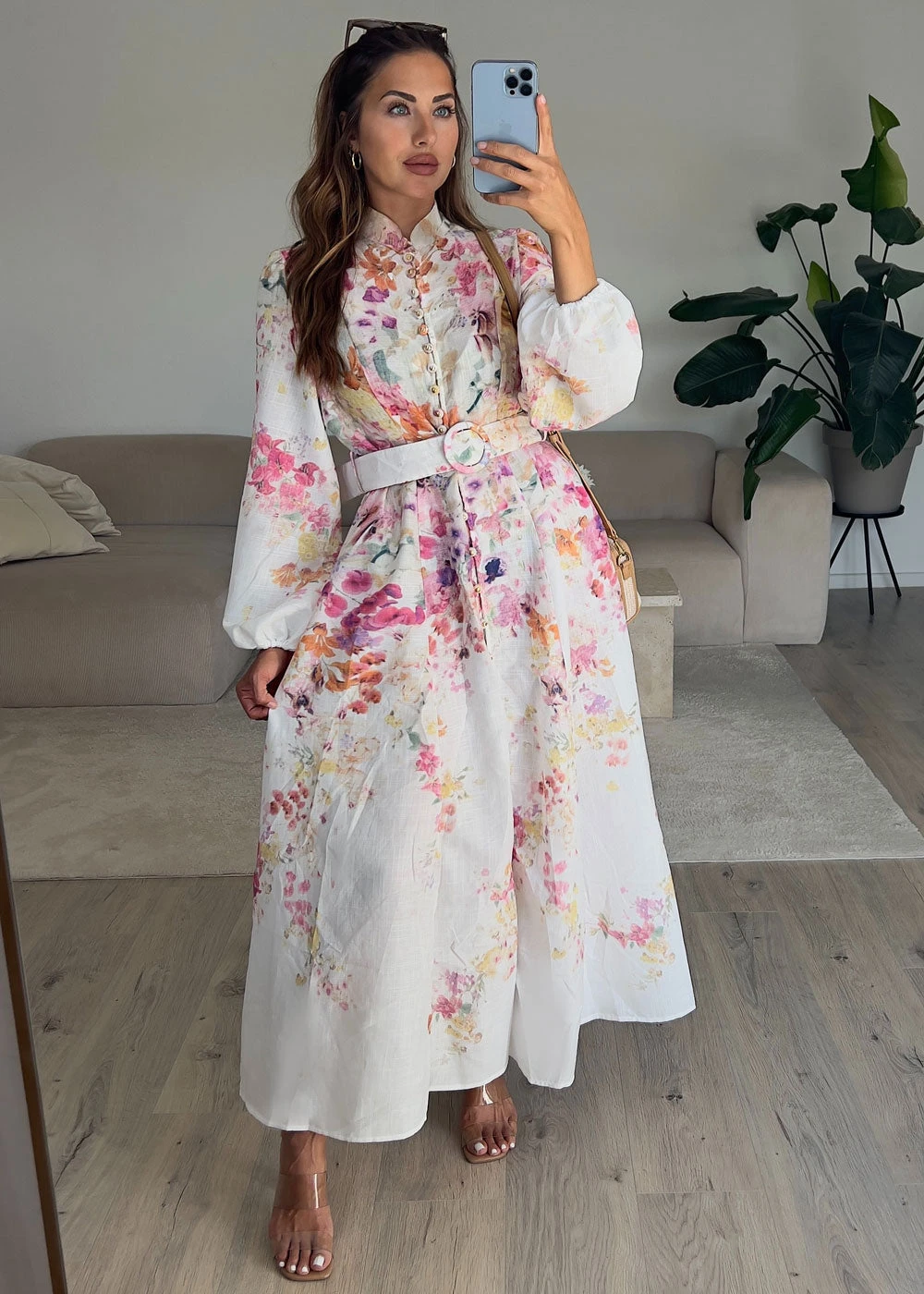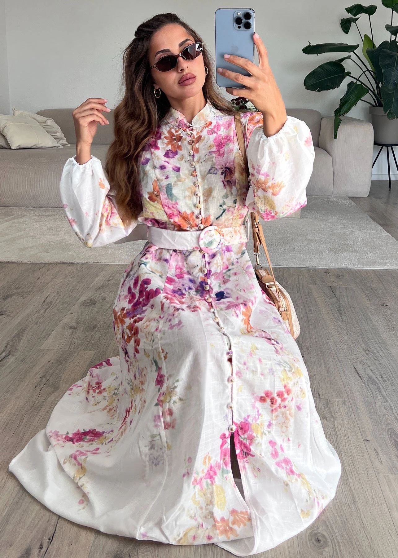 Dieses Maxikleid ist ein echter Eyecatcher – romantisch, farbenfroh und feminin. Der zarte Aquarell-Print verleiht dem Kleid einen verspielten Look, während die durchgehende Knopfleiste und der Gürtel mit dekorativer Schnalle die Figur wunderschön betonen. Die Puffärmel runden das Design stilvoll ab.