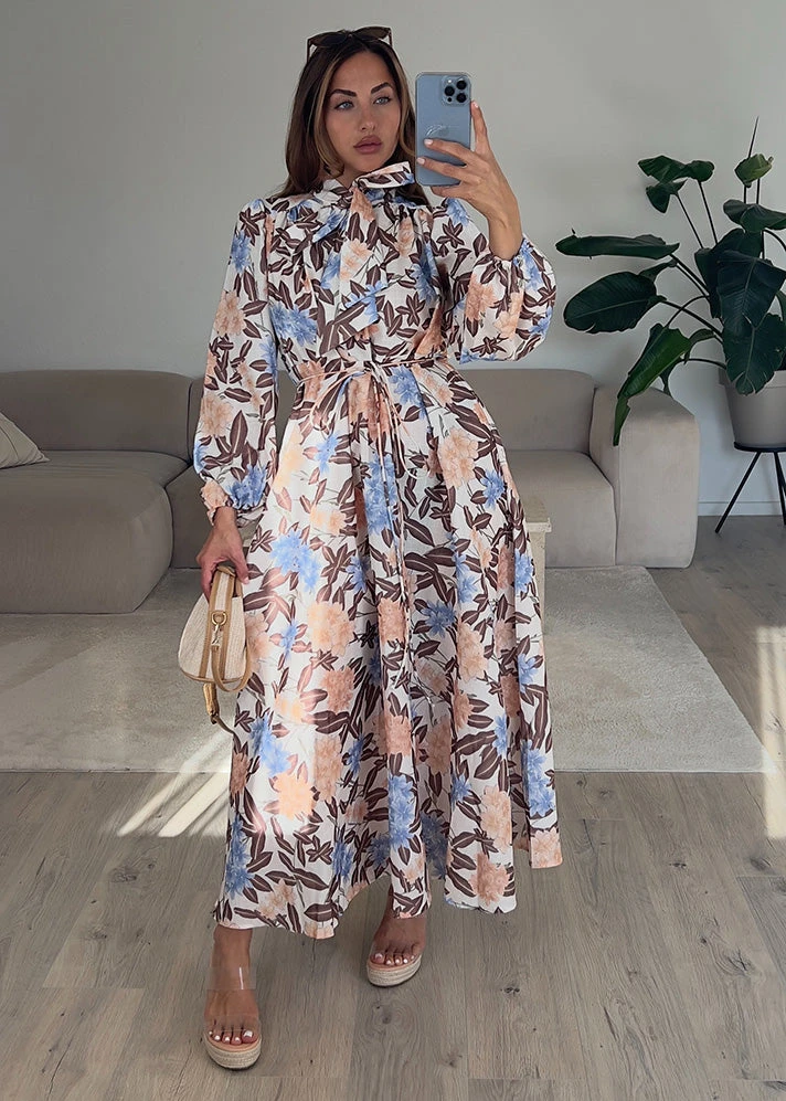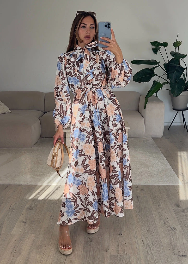Elegant, feminin und voller Farbharmonie – dieses Maxikleid besticht durch sein auffälliges Blumenmuster und die edle Schleife am Halsausschnitt. Der leichte Stoff fällt fließend und wird durch den Taillengürtel schön in Form gebracht. Die langen Ärmel mit Gummibund sorgen für eine luftige Silhouette und angenehmen Tragekomfort.