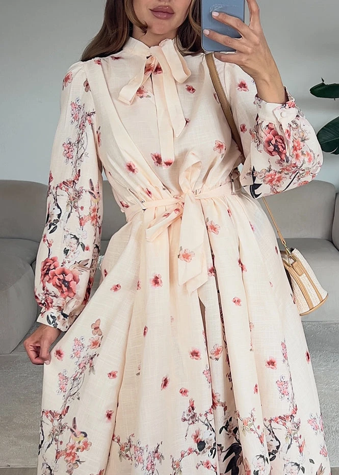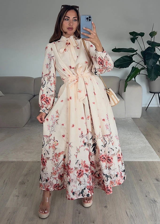 Ein Kleid wie aus einem Märchen – dieses Maxikleid verzaubert mit romantischem Blumenprint, verspieltem Schleifenkragen und einer femininen Silhouette. Der Taillengürtel sorgt für eine schmeichelhafte Passform, während die leicht ausgestellten Ärmel dem Look eine besondere Eleganz verleihen.