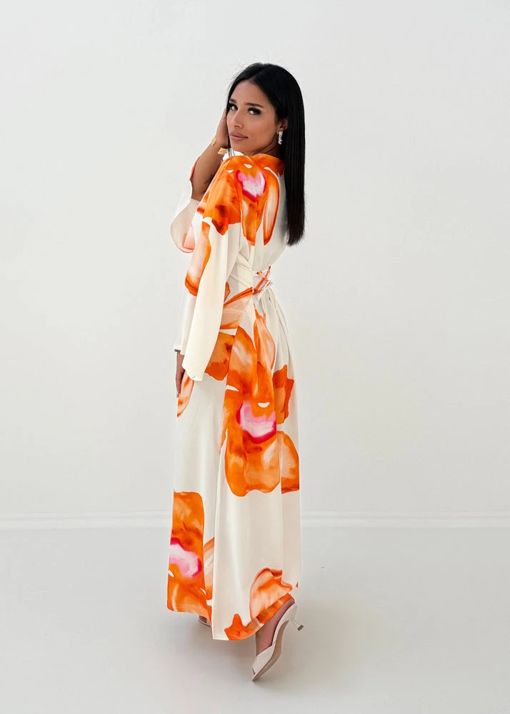 Dieses fließende Maxikleid von NAHA vereint feminine Leichtigkeit mit einem ausdrucksstarken Blumenmuster. Die weich fallenden, weit geschnittenen Ärmel und der entspannte Maxilook verleihen dem Kleid eine elegante Silhouette, während der leichte Stoff für hohen Tragekomfort sorgt. Ein dezenter Taillengürtel betont die Figur und macht das Modell zur perfekten Wahl für besondere Anlässe, sommerliche Events oder entspannte Abende.