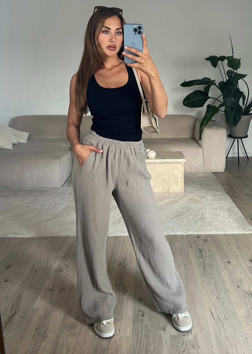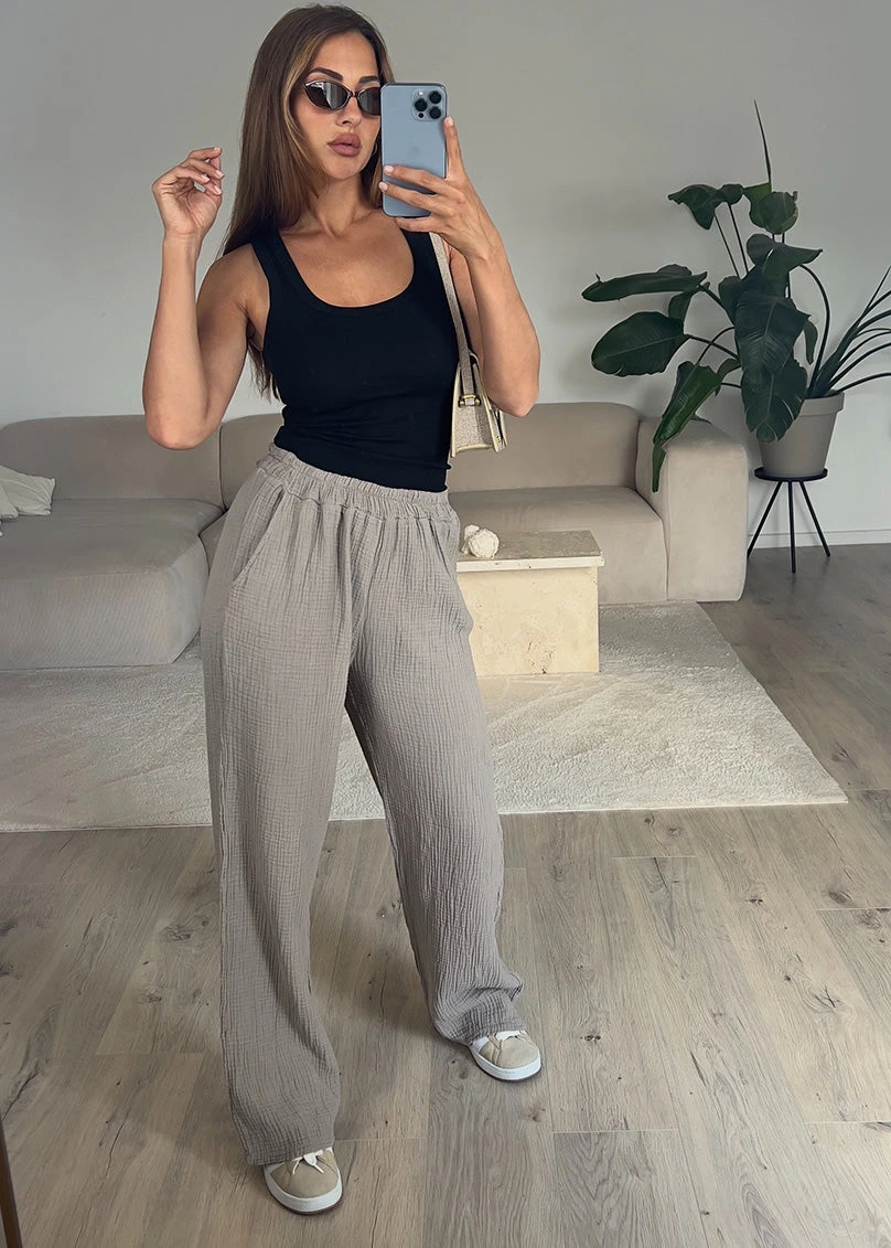 Diese weite Musselin-Hose ist der Inbegriff von Komfort und Leichtigkeit – und dabei absolut stilvoll. Gefertigt aus 100 % atmungsaktiver Baumwolle, bietet sie dir ein angenehmes Tragegefühl – ideal für warme Tage oder entspannte Stunden zu Hause. Der elastische Bund sorgt für einen perfekten Sitz, während der lockere Schnitt eine schmeichelhafte Silhouette kreiert. Die weiche Crinkle-Struktur des Musselin-Stoffs verleiht der Hose ihren lässigen Look.