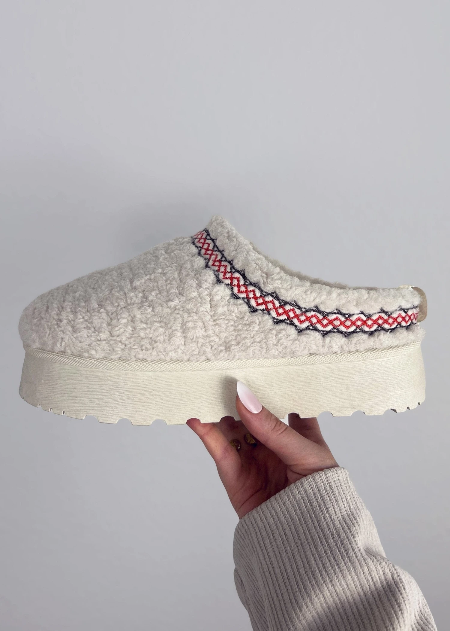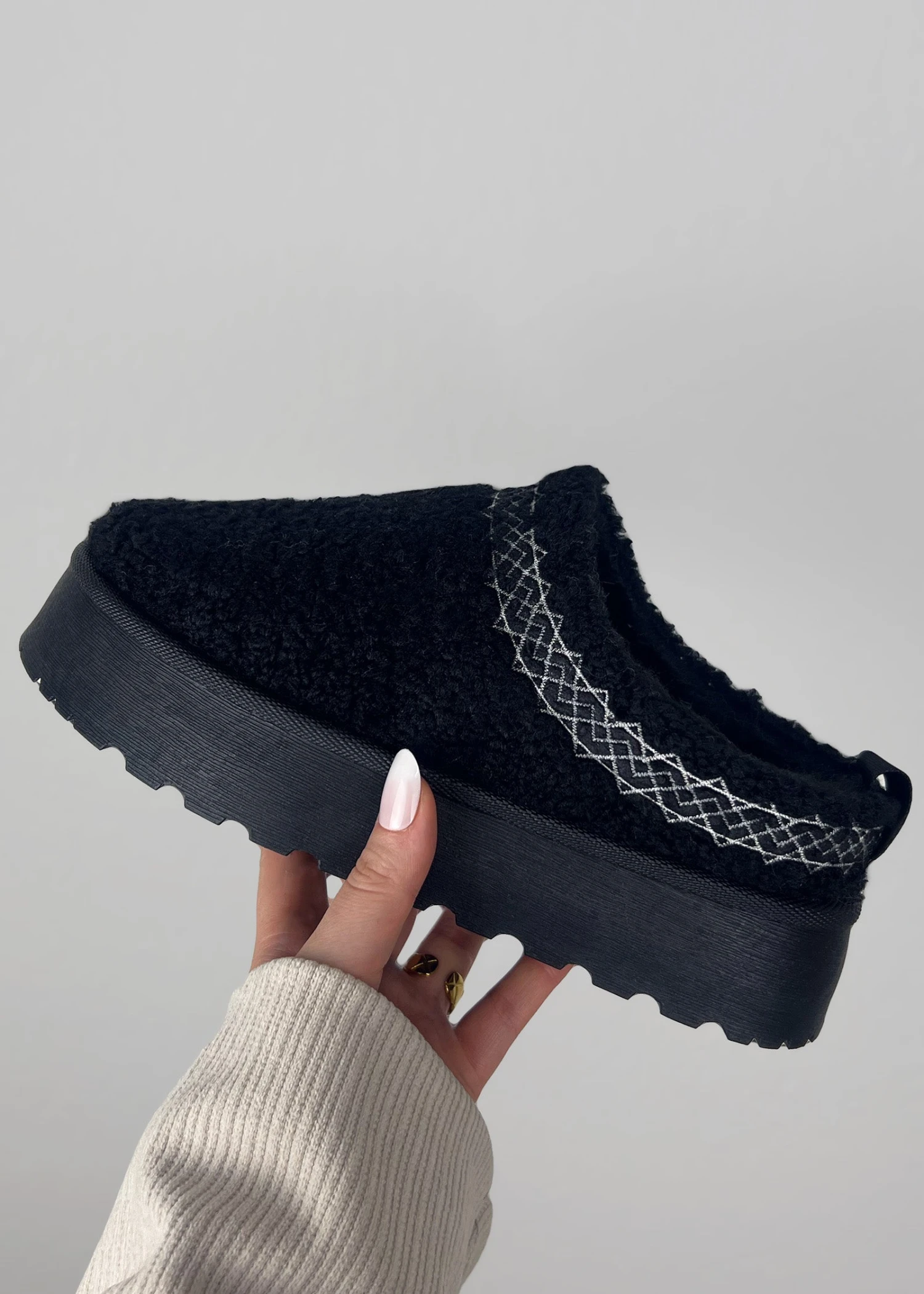 Diese cozy Pantoletten sind der perfekte Mix aus Style und Komfort. Mit ihrem flauschigen Bouclé-Design und der robusten Sohle bist du bestens für entspannte Tage gerüstet. Der gestickte Akzent verleiht dem Look das gewisse Etwas. Ideal für deine Alltags-Chillouts!