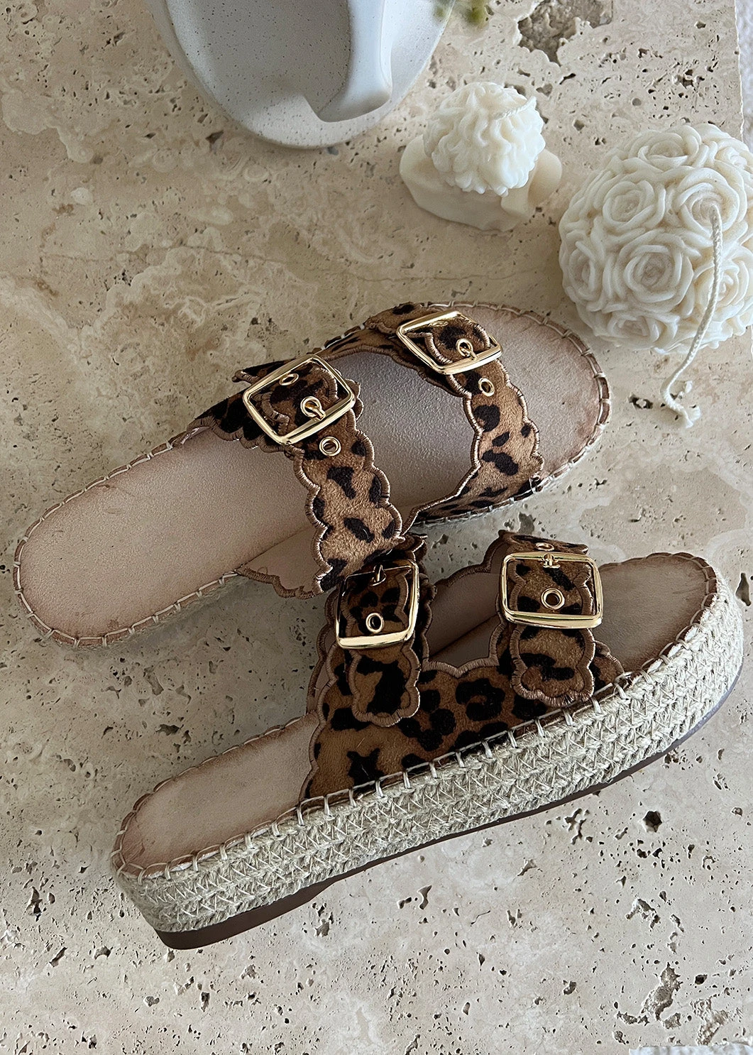 Ein echter Hingucker für den Sommer: Diese Plateau-Sandalen überzeugen mit auffälligem Leopardenprint und goldenen Schnallen. Die gewellte Kantenverarbeitung verleiht dem Design eine verspielte Note, während die Bastsohle für sommerliches Flair sorgt. Die gepolsterte Innensohle bietet Komfort bei jedem Schritt – perfekt für lange Tage und stylische Outfits. Ob lässig zur Jeans oder als Highlight zum Kleid – diese Sandalen setzen ein Statement.
