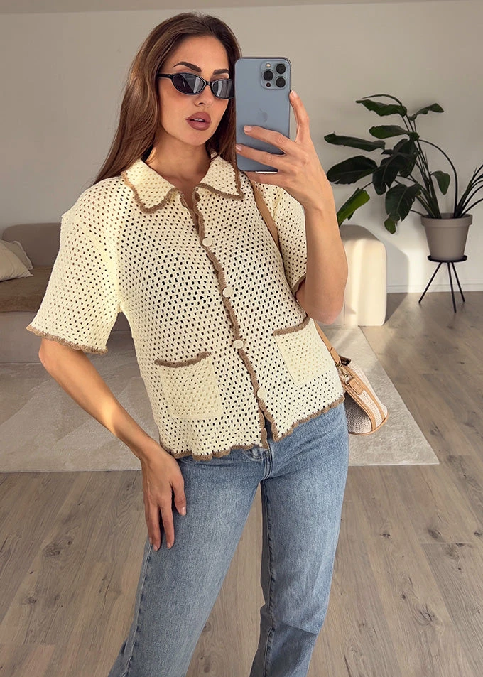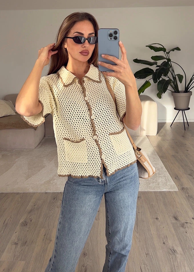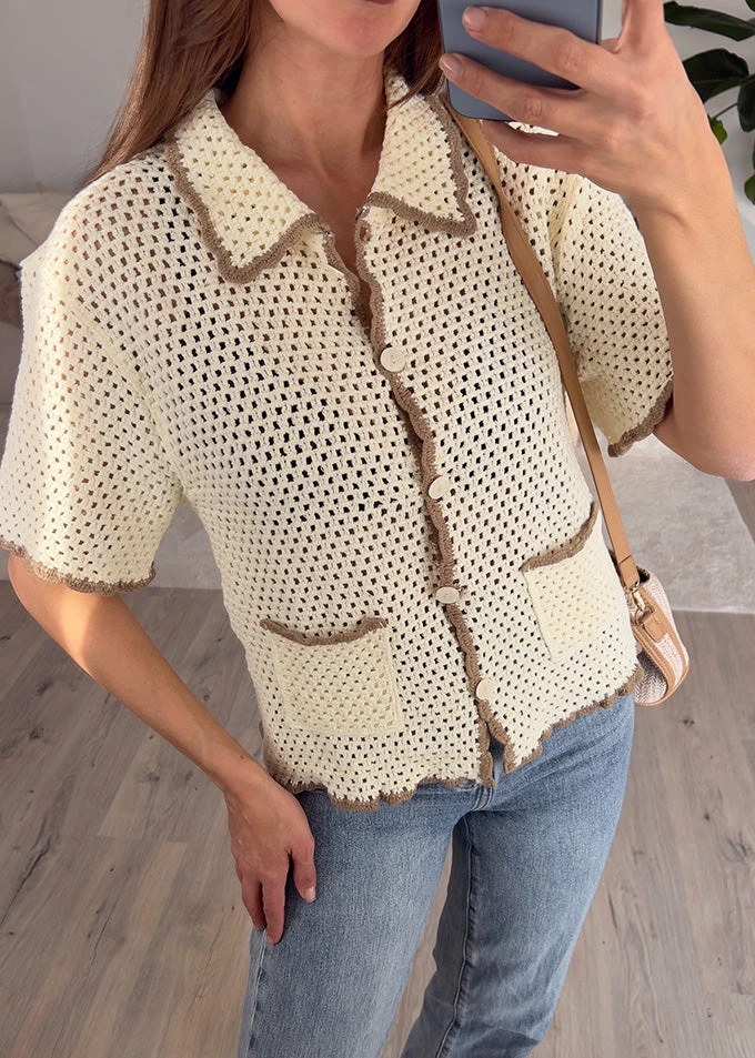 Ein echter Hingucker! Dieser leichte Cardigan im Häkel-Look kombiniert Vintage-Charme mit modernem Style. Die kurzen Ärmel und die verspielten Details machen ihn perfekt für entspannte Outfits.