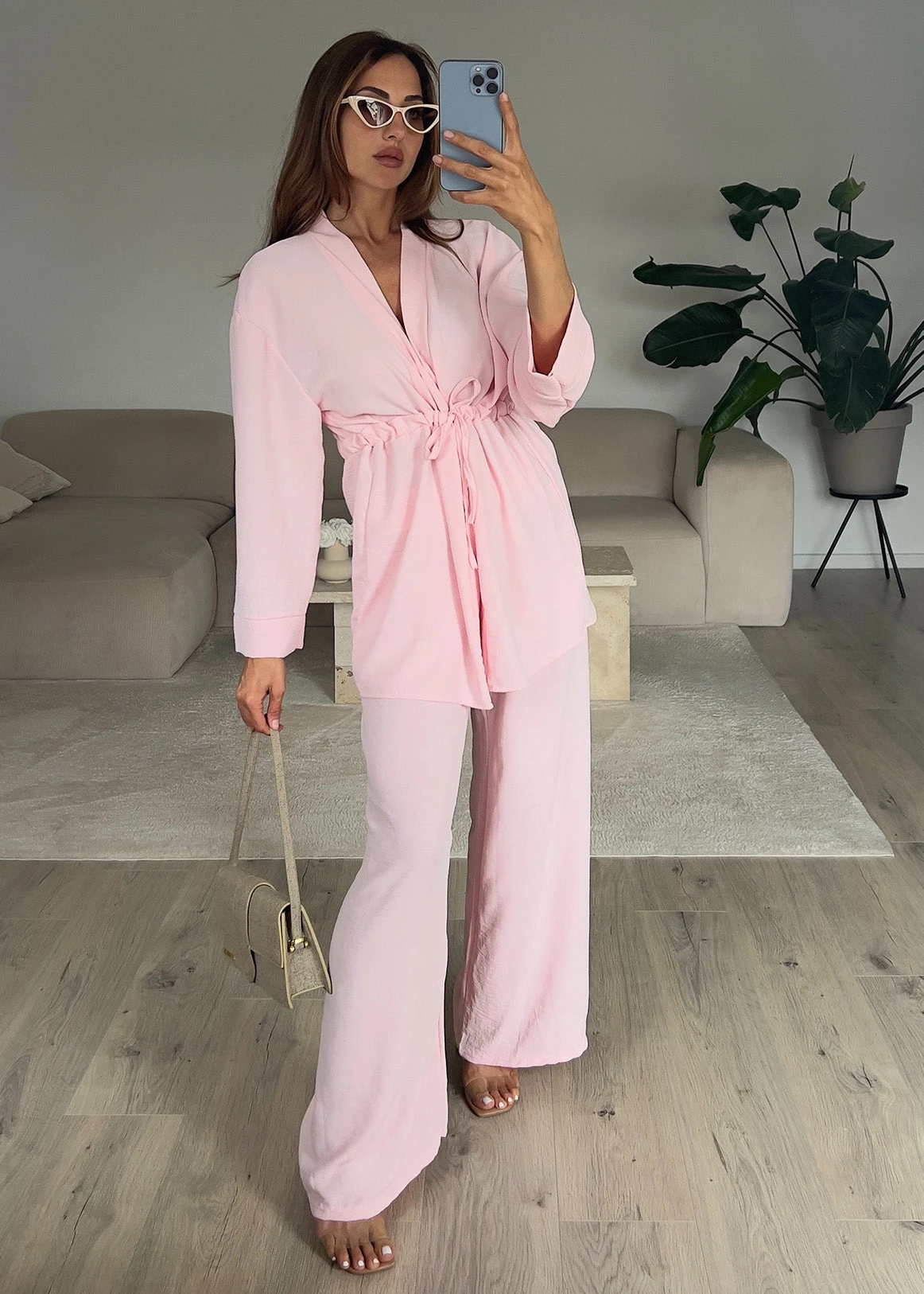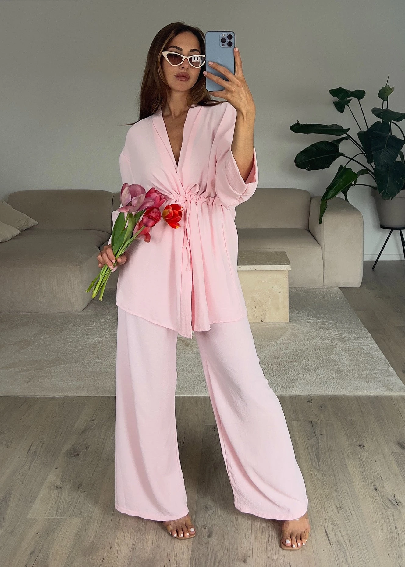 Dieses Zweiteiler-Set kombiniert Komfort mit moderner Eleganz. Die weit geschnittene Hose in Kombination mit der locker fallenden Tunika-Jacke mit Taillenzug zaubert eine schmeichelhafte Silhouette und sorgt gleichzeitig für maximale Bewegungsfreiheit.