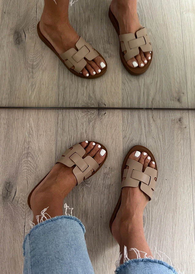 Diese stylischen Slip-On-Sandalen überzeugen mit einem cleanen, modernen Look und einem Hauch von Eleganz. Das breite Riemendesign in hochwertiger Lederoptik verleiht dem Schuh Struktur und Charakter, während die weiche, vorgeformte Innensohle für angenehmen Tragekomfort sorgt. Die erhöhte Laufsohle in warmem Braunton bietet leichten Halt und rundet den Look harmonisch ab.