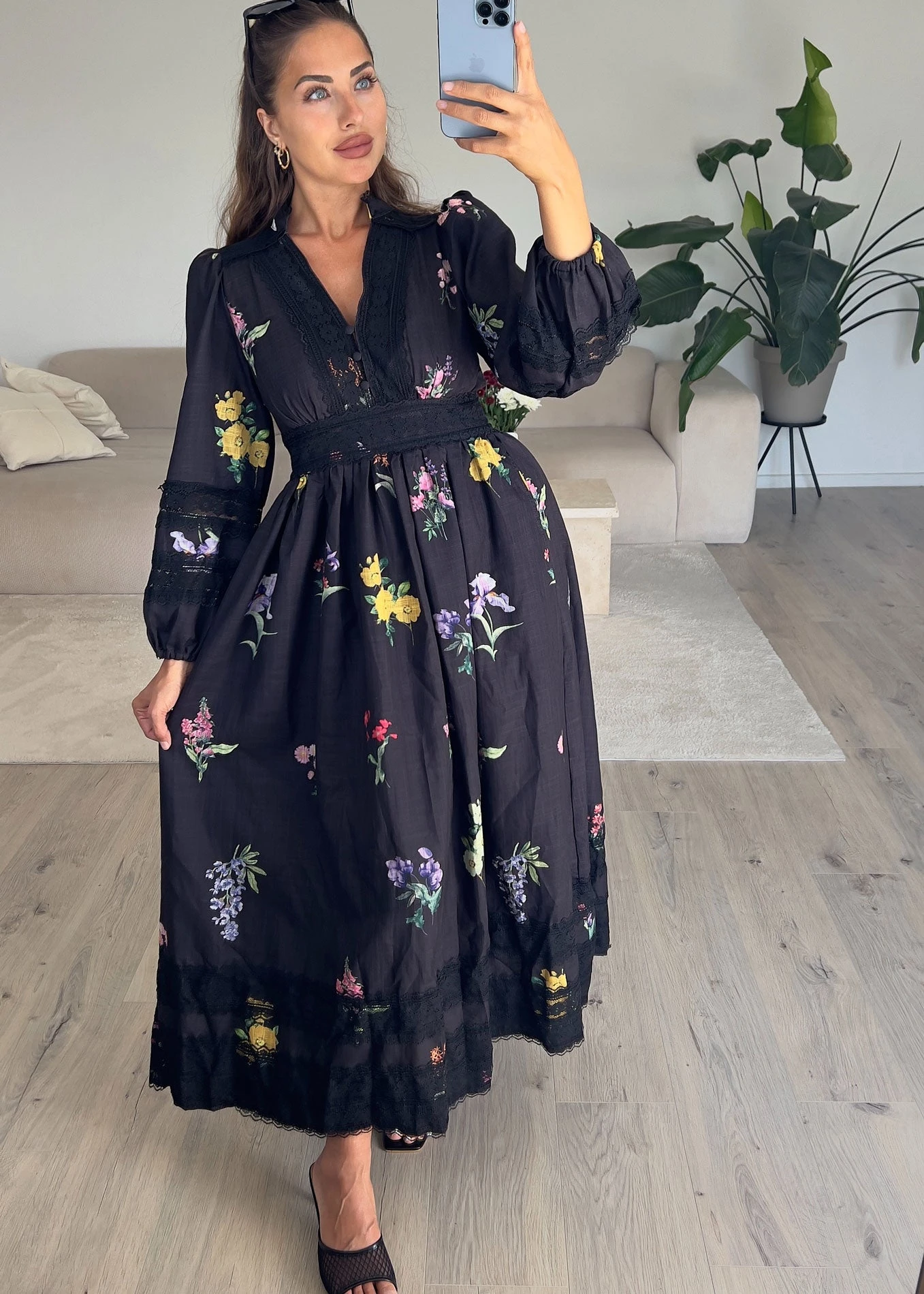 Elegantes Maxikleid in Schwarz mit farbenfrohem Blumenmuster und feinen Spitzendetails. Die fließende Silhouette, der V-Ausschnitt und die leicht ausgestellten Ärmel verleihen dem Modell eine feminine Note.