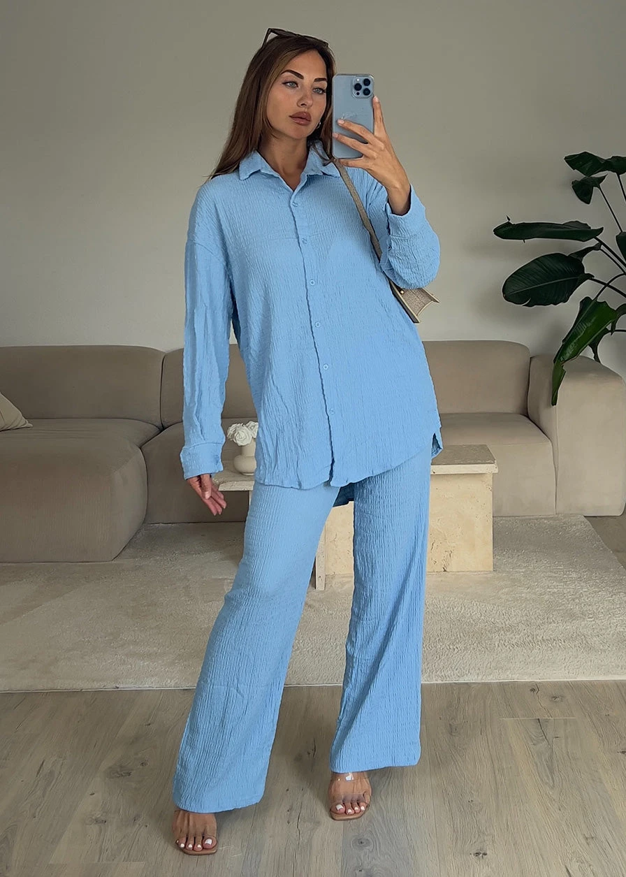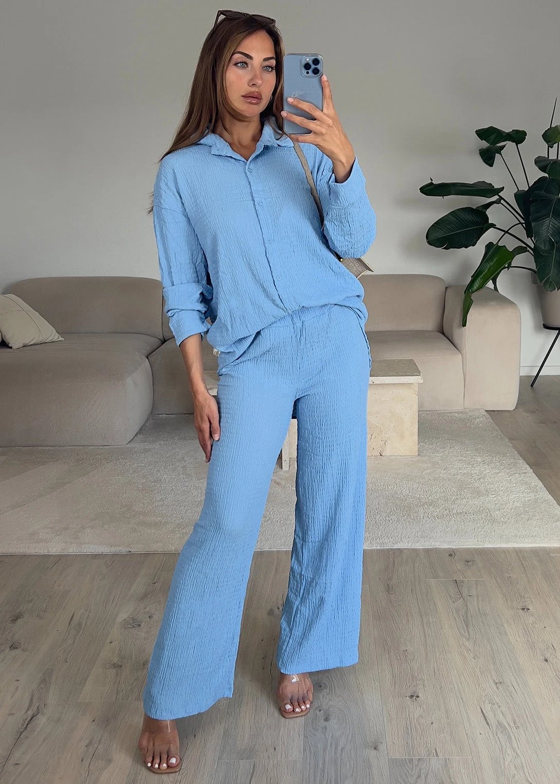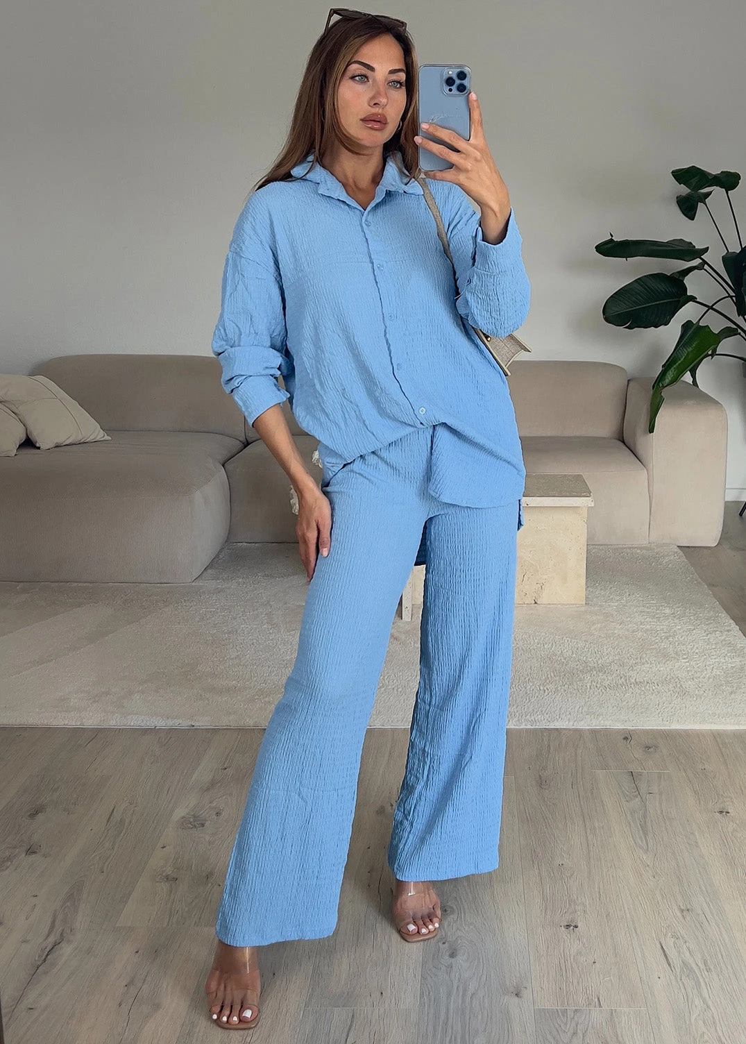 Minimalistisch, modern und super bequem – dieser Zweiteiler aus leicht strukturiertem Polyester-Stoff ist dein perfekter Begleiter für Alltag oder Urlaub. Das lockere Hemd mit Knopfleiste verleiht dem Look eine entspannte Note, während die gerade geschnittene Hose mit elastischem Bund für Komfort sorgt.