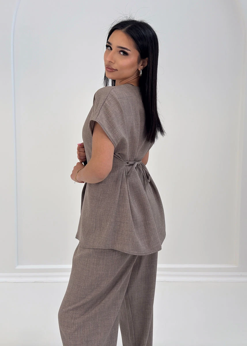 Zweiteiler-Set mit locker fallender Bluse und dekorativem Zierknopf. Die Bluse lässt sich mit einem schmalen Bindeband wahlweise vorn oder hinten binden – für einen individuell anpassbaren Look. Die weit geschnittene Hose rundet das Outfit mit maximalem Komfort ab.